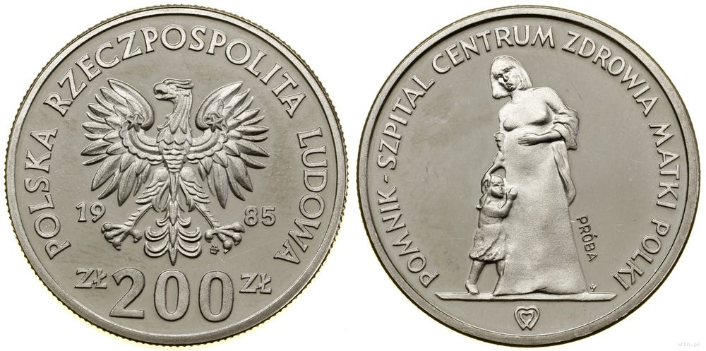 | Opis: | Polska - Polska Rzeczpospolita Ludowa (1952–1989) - monety próbne, 200 złotych, 1985, Warszawa, Pomnik Szpital Centrum Zdrowia Matki Polki, PRÓBA NIKIEL (odmiana z odwróconym znakiem mennicy) |
