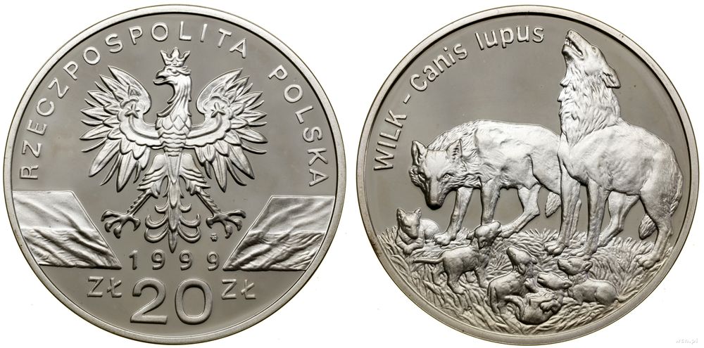 | Opis: | Polska - III Rzeczpospolita Polska (od 1989) - monety kolekcjonerskie, 20 złotych, 1999, Warszawa, Wilki – Canis lupus |