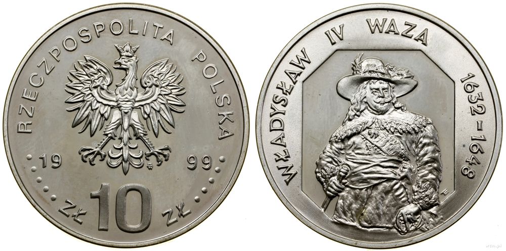 | Opis: | Polska - III Rzeczpospolita Polska (od 1989) - monety kolekcjonerskie, 10 złotych, 1999, Warszawa, Władysław IV Waza (1632–1648) – półpostać |