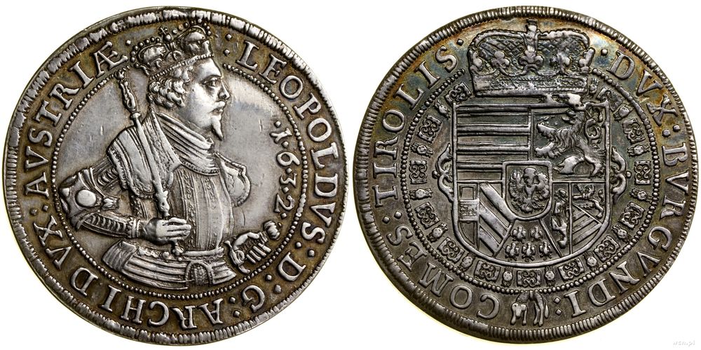 | Opis: | Austria - arcyksiążę Leopold V (1619–1632), talar, 1632, Hall, Aw: Półpostać władcy trzymającego berło oraz rękojeść miecza, legenda; Rw: Ukoronowana, wielopolowa tarcza herbowa otoczona łańcuchem z orderem Złotego Runa, legenda |