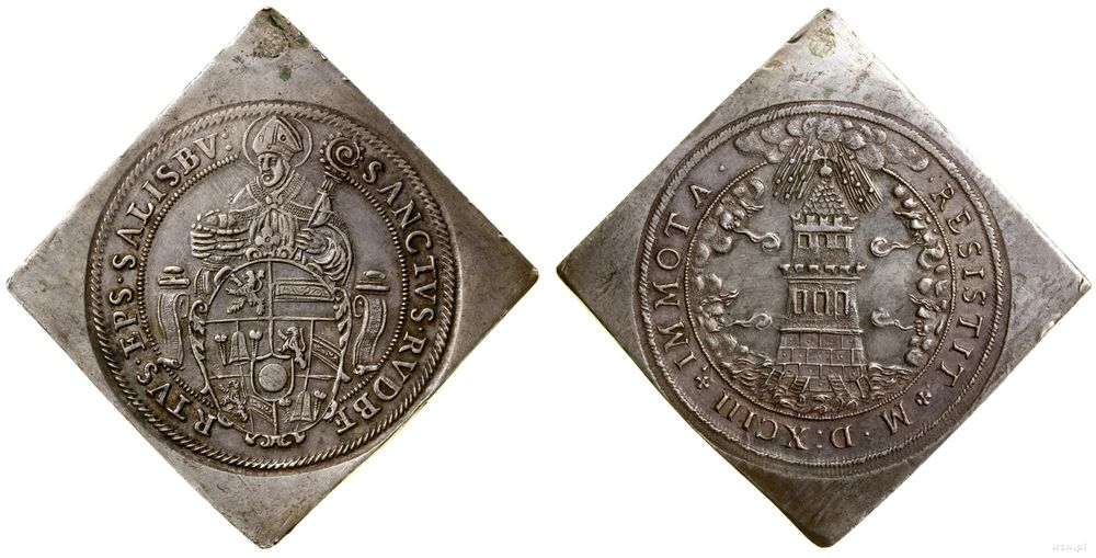 | Opis: | Austria - Salzburg - arcybiskupstwo - Wolf Dietrich Raitenau (1587–1612), klipa talara, 1593, Salzburg, Aw: Święty Rupert w biskupich regaliach, wokoło napis SANCTVS RVDBERTVS EPS SALISBV; Rw: Wieża pośród fal, wokoło napis RESISTIT M D XCIII IMMOTA |