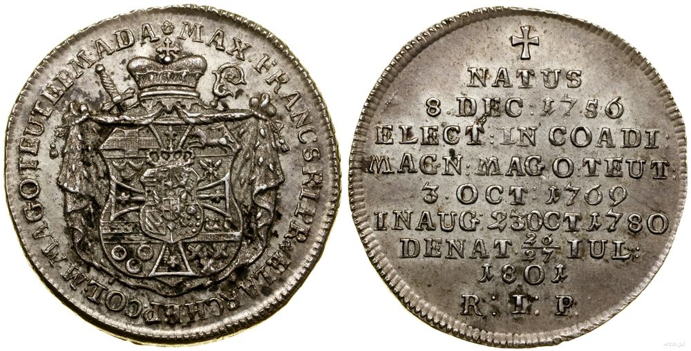 | Opis: | Austria - Zakon Krzyżacki w Mergentheim - Maksymilian II Franciszek (1780–1801), ćwierćtalar pośmiertny, 1801, Würzburg, Aw: Ukoronowana tarcza herbowa, legenda; Rw: Dziewięciowierszowy poziomy napis |