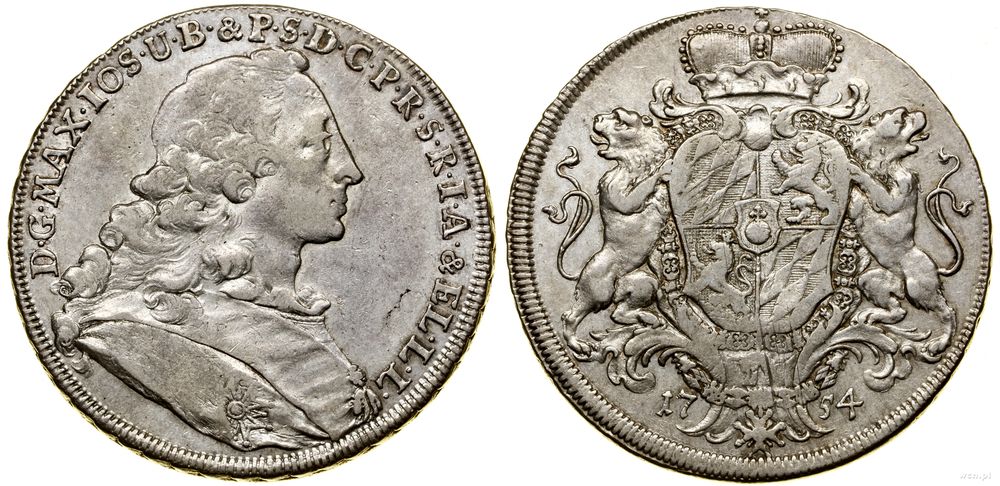 | Opis: | Niemcy - Bawaria - Maksymilian III Józef (1745–1777), talar, 1754, Monachium, Aw: Popiersie władcy w prawo, legenda, Rw: Ukoronowana tarcza herbowa trzymana przez dwa lwy, poniżej data |