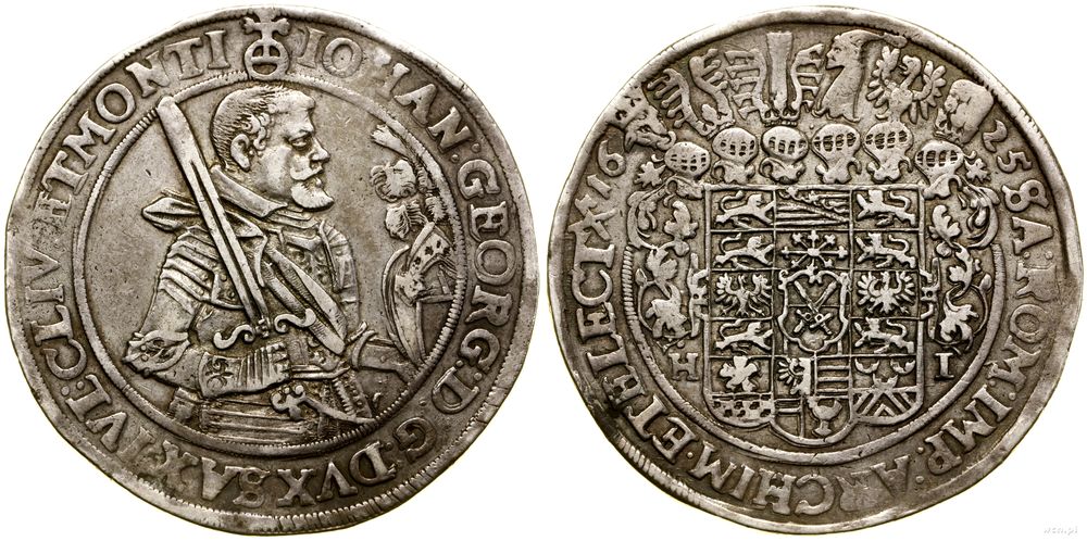 | Opis: | Niemcy - Saksonia - linia albertyńska (1547–1918) - Jan Jerzy I (1615–1656), talar, 1625, Drezno, Aw: Półpostać władcy w prawo, wokoło legenda, Rw: Wielopolowa tarcza herbowa, powyżej hełmy z klejnotami i labrami, w otoku legenda |