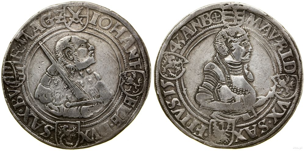 | Opis: | Niemcy - Saksonia - linia ernestyńska (1486–1547) - Jan Fryderyk I i Maurycy (1541–1547), talar, 1543, Annaberg, Aw: Popiersie Jana Fryderyka, legenda; Rw: Popiersie Maurycego, legenda |