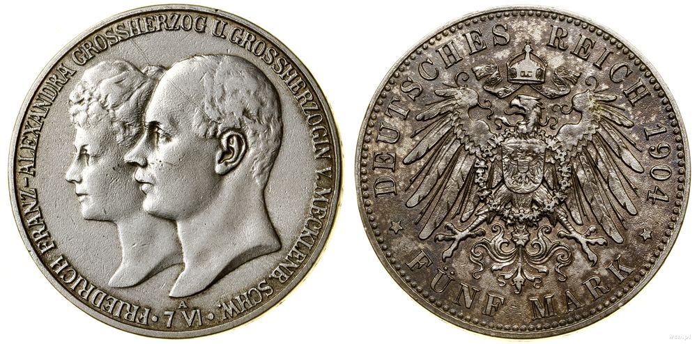 | Opis: | Niemcy - Meklenburgia-Szwerin - Fryderyk Franciszek IV (1897–1918), 5 marek zaślubinowe, 1904 A, Berlin, moneta wybita z okazji ślubu z księżniczką Aleksandrą |