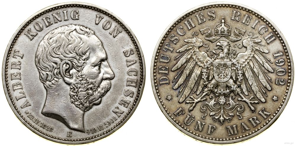| Opis: | Niemcy - Saksonia - linia albertyńska (1547–1918) - Albert (1873–1902), 5 marek pośmiertne, 1902 E, Muldenhütten |