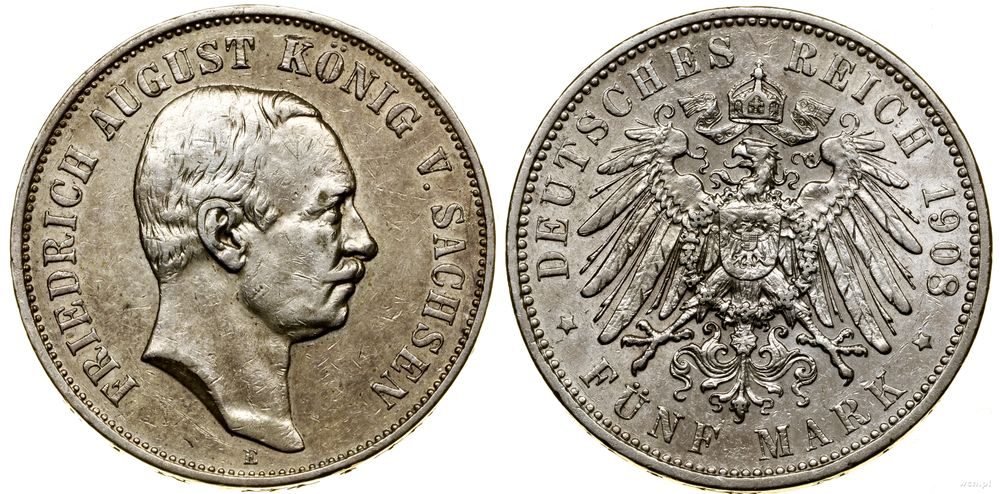 | Opis: | Niemcy - Saksonia - linia albertyńska (1547–1918) - Fryderyk August III (1904–1918), 5 marek, 1908 E, Muldenhütten |