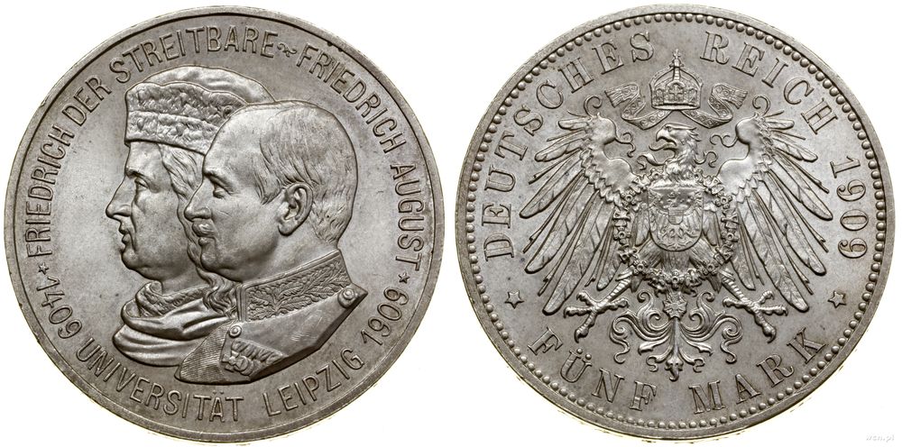 | Opis: | Niemcy - Saksonia - linia albertyńska (1547–1918) - Fryderyk August III (1904–1918), 5 marek, 1909 E, Muldenhütten, 500-lecie Uniwersytetu w Lipsku |
