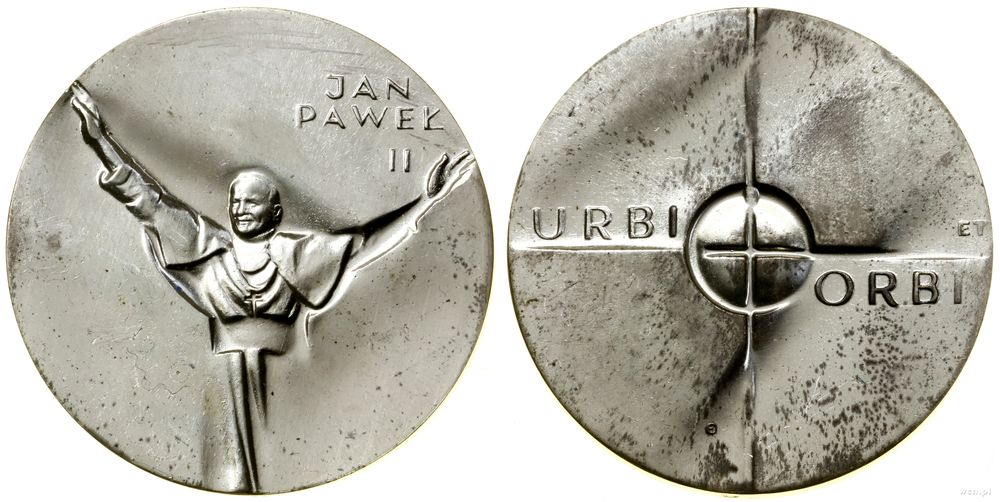 | Opis: | Polska - Polska Rzeczpospolita Ludowa (1952–1989), medal Urbi et Orbi, 1979, Częstochowa, Aw: Postać papieża lekko w lewo, z umiesionymi rękami, JAN / PAWEŁ / II, Rw: Krzyż na którym okrąg, URBI - ET / ORBI, na obrzeżu punca srebra i punca producenta, projektowała Ewa Olszewska-Borys, wybity w Zjednoczonych Zespołach Gospodarczych Sp. z o. o. w Częstochowie |