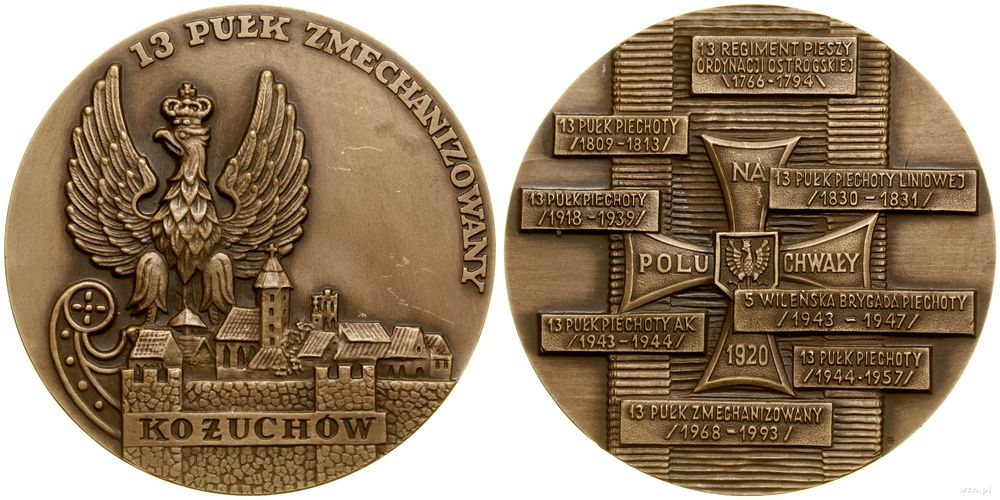 | Opis: | Polska - III Rzeczpospolita Polska (od 1989), 13. Pułk Zmechanizowany – Kożuchów, 1993, Warszawa, Aw: Panorama miasta, w tle orzeł wojskowy, na murach KOŻUCHÓW, 13 PUŁK ZMECHANIZOWANY, Rw: Krzyż Walecznych na tle wstążki, wokół plakiety z historycznymi nazwami pułku, projektowała i wykonała Stanisława Wątróbska |