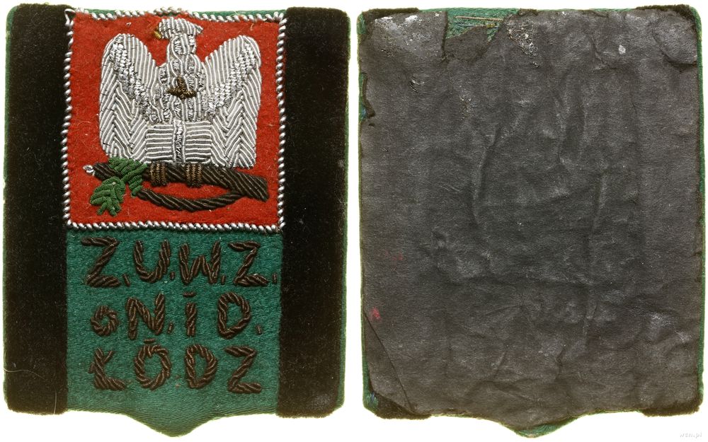 | Opis: | Polska - Rzeczpospolita Polska powojenna (1945–1952), oznaka, (1945–1949), Tarcza, na której orzeł stojący na karabinie, pod nim Z.U.W.Z. / o N.i D / ŁÓDŹ |