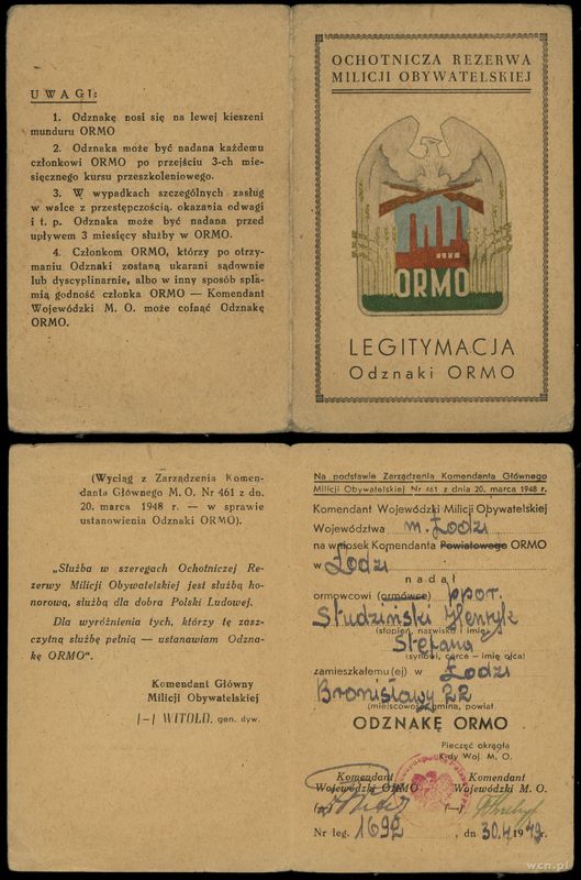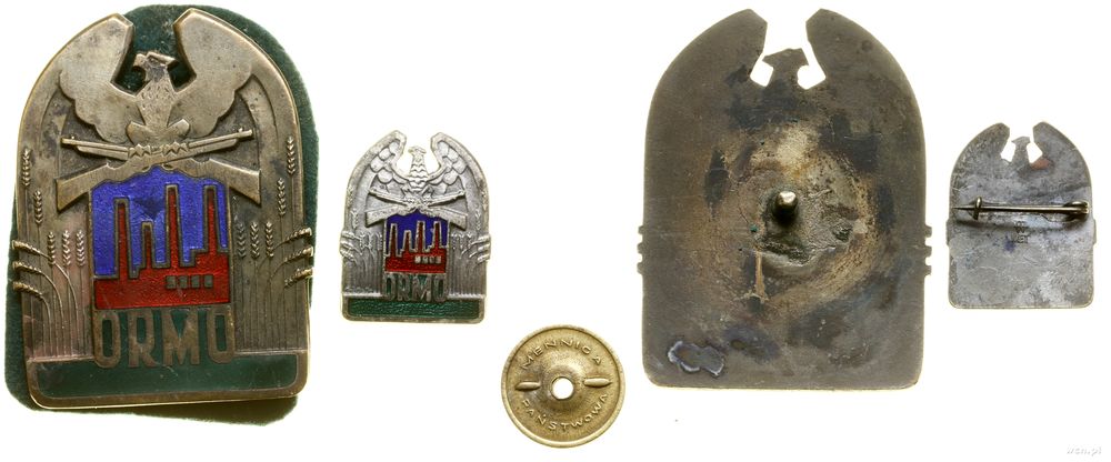 | Opis: | Polska - Polska powojenna (1944–1952), odznaka ORMO, 1949, Orzeł trzymający w szponach dwa karabiny, niżej panorama fabryki pod którą ORMO, z boków kłosy zboża, odznaka jednoczęściowa, mocowana na słupek, nakrętka sygnowana MENNICA - PAŃSTWOWA, dodatkowo miniatura oraz legiymacja wystawiona na nazwisko Studziński Henryk |