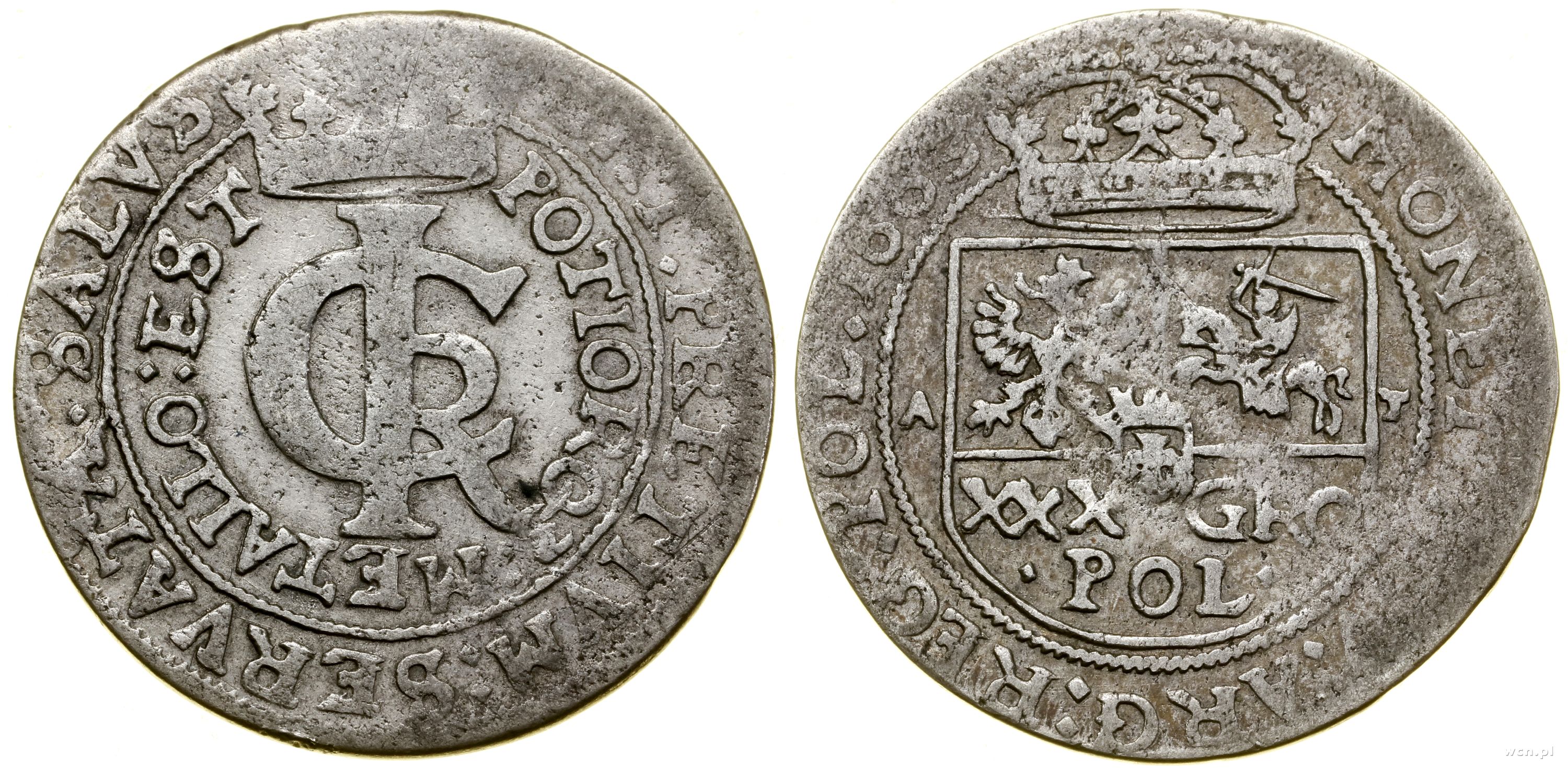 rzadsza odmiana z herbem Leliwa pod popiersiem króla, koń... | III- |