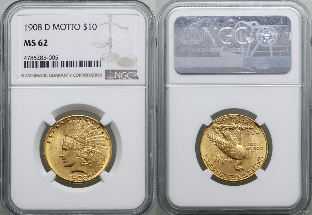 | Opis: | Stany Zjednoczone Ameryki (USA), 10 dolarów, 1908 D, Denver, typ Indian Head, with motto |