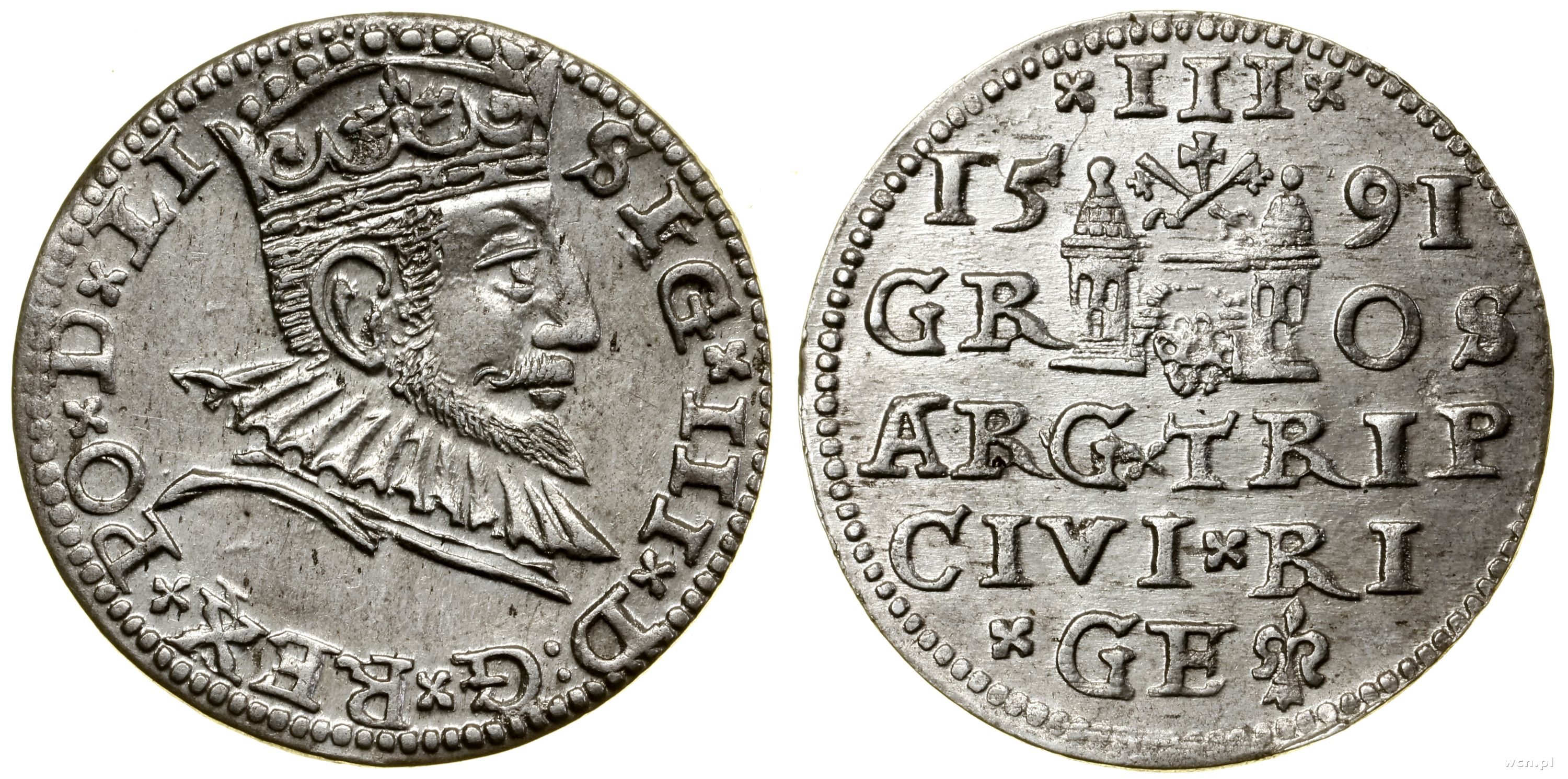 | Opis: | Polska - Zygmunt III Waza (1587–1632) - miasto Ryga, trojak, 1591, Ryga, końcówka legendy awersu LI |