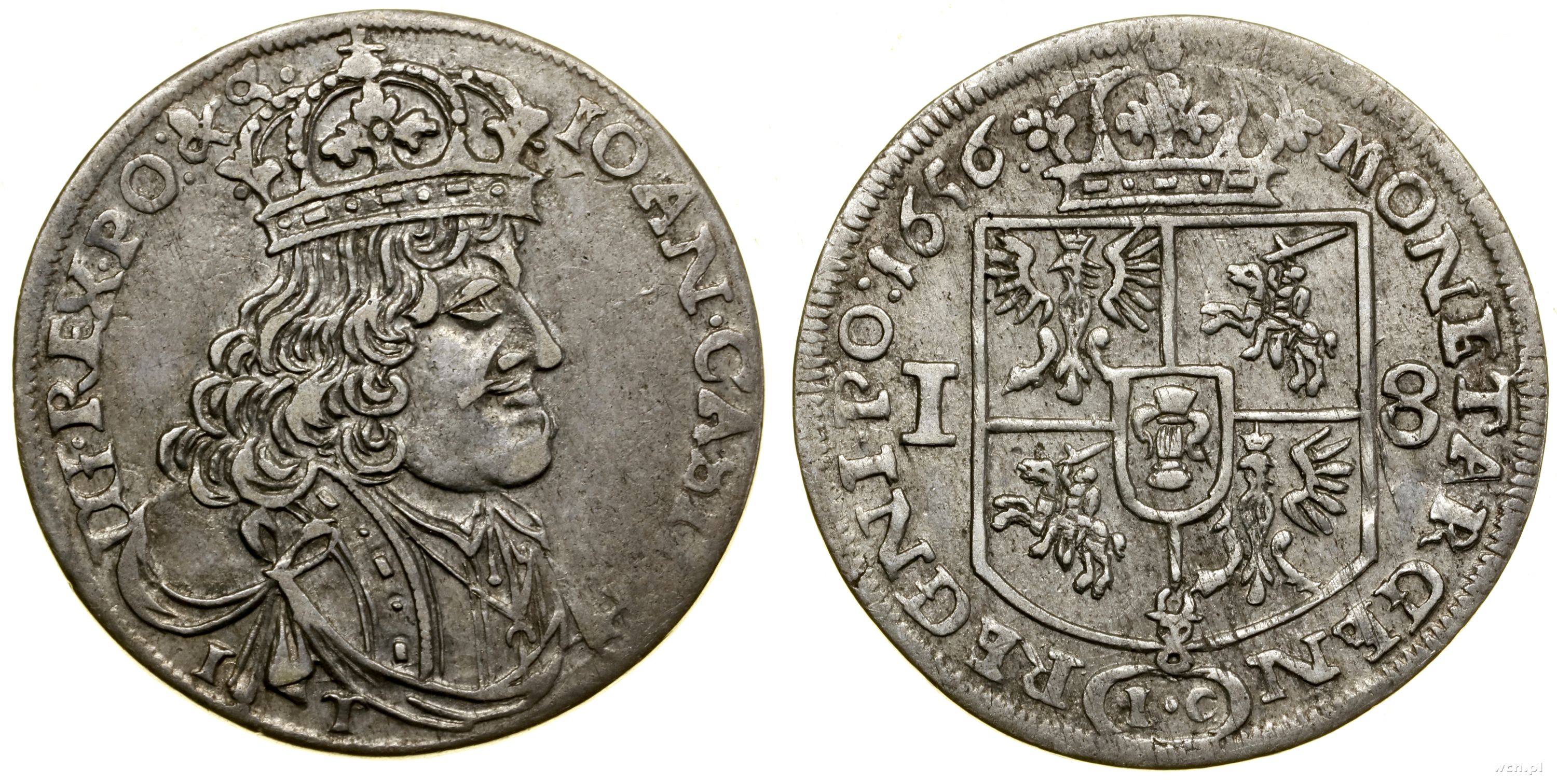 | Opis: | Polska - Jan II Kazimierz Waza (1649–1668) - monety koronne, ort, 1656 IT, Kraków, na awersie CASIMI, I-T pod popiersiem, bez obwódek po obu stronach monety, litery I.C pod tarczą herbową |