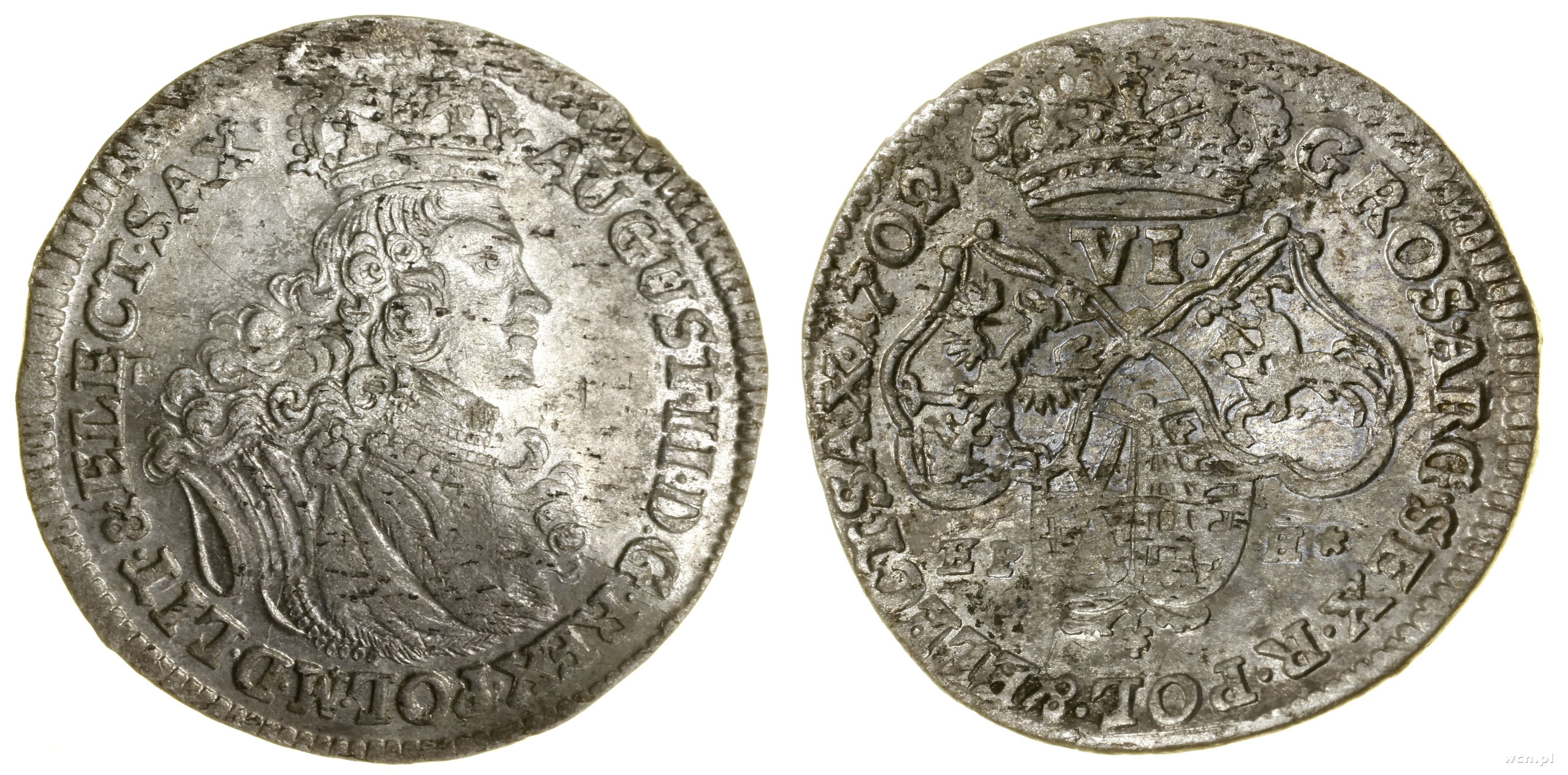 | Opis: | Polska - August II Mocny (1697–1733) - monety polsko-saskie, szóstak, 1702 EPH, Lipsk, data na końcu legendy rewersu, na dole litery EP-H (mincmistrz Ernst Peter Hecht) |