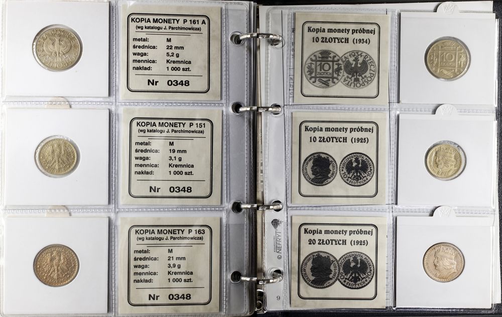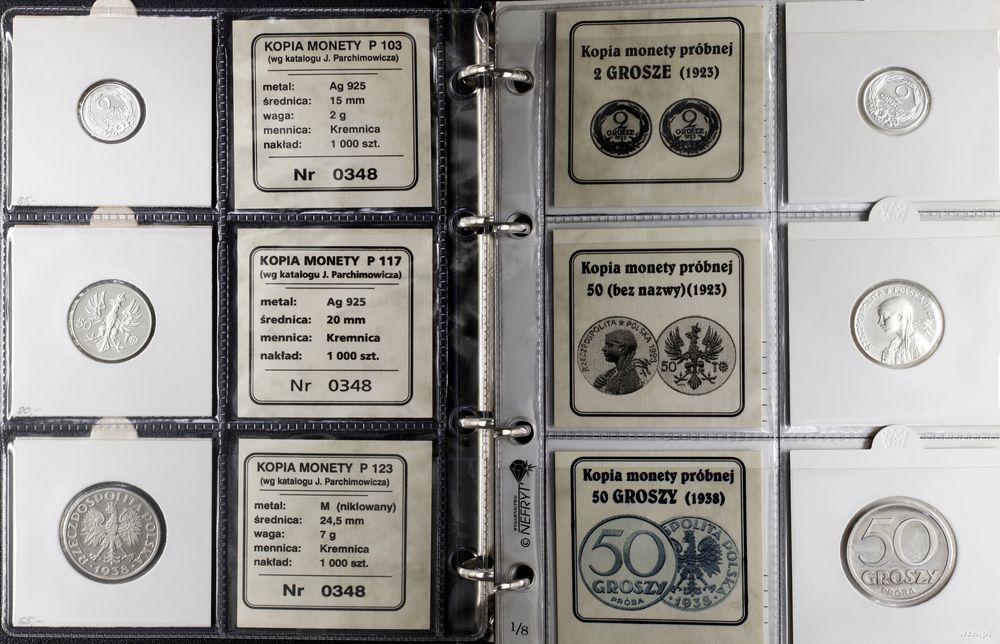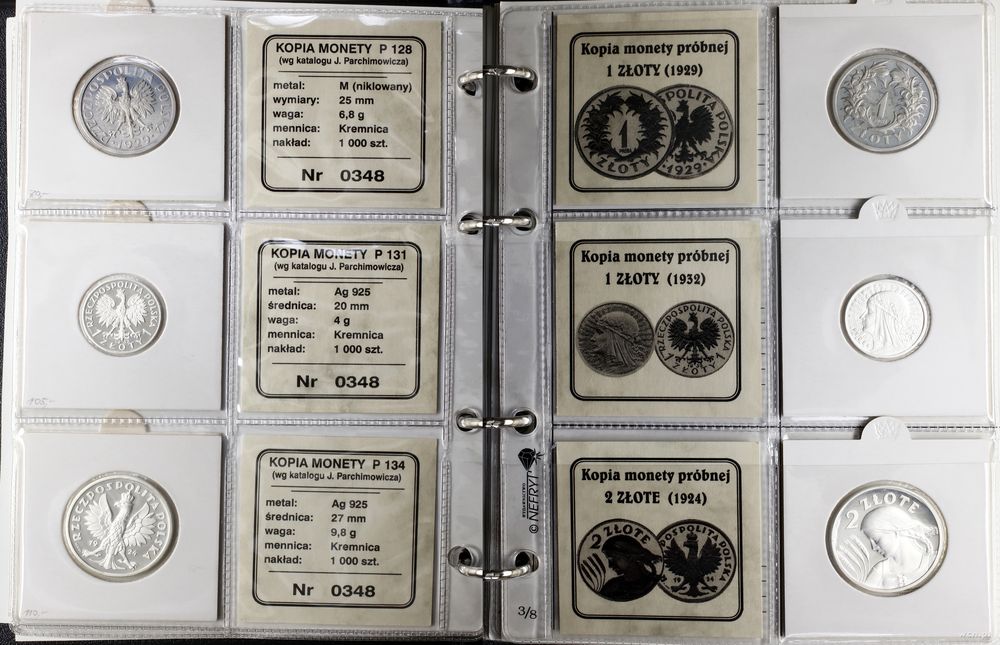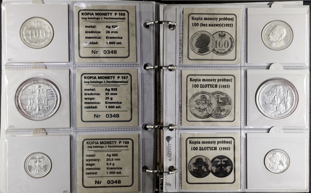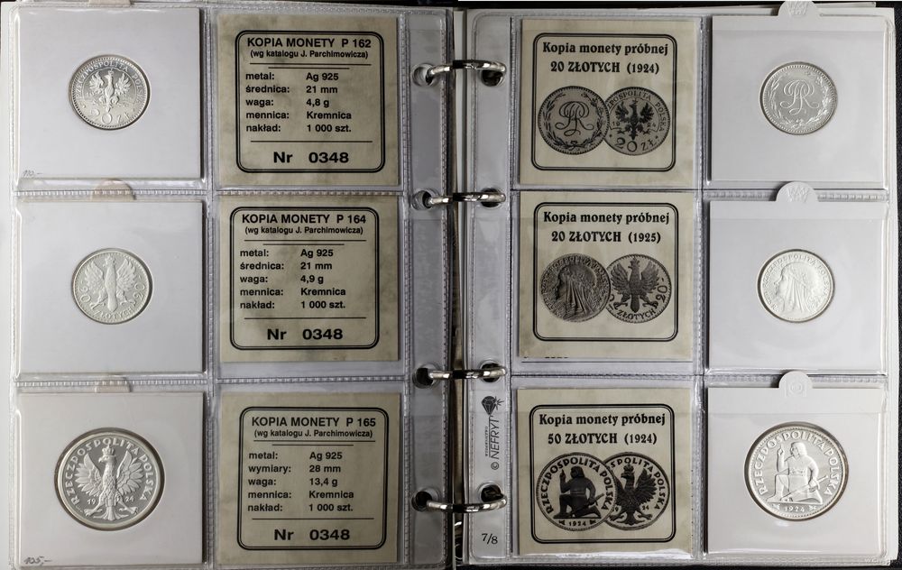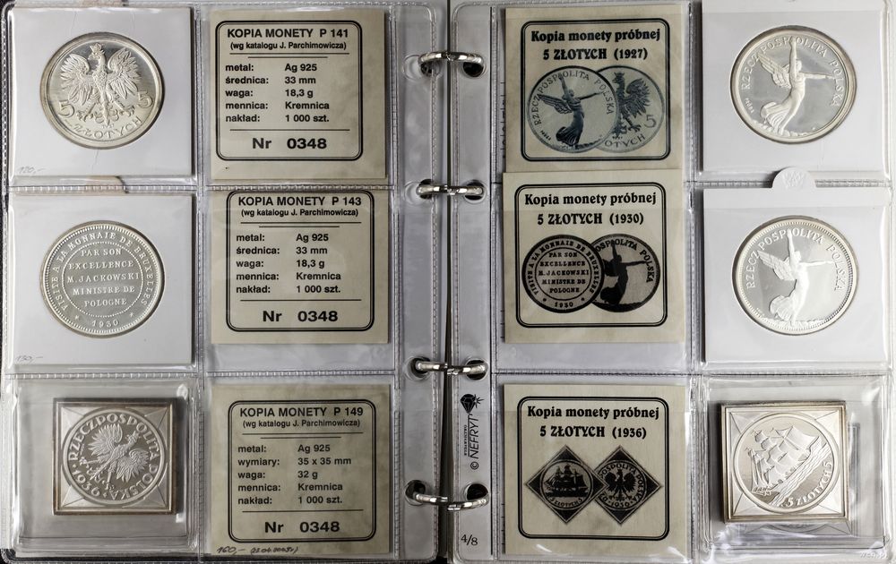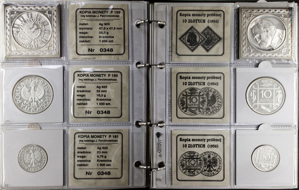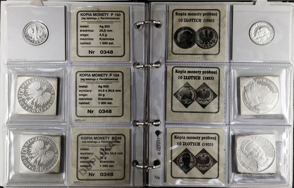 | Dodatkowe informacje: | całość w oficjalnym klaserze, z monetami w holderach po 3 sztuki na stronie z kompletem certyfikatów do każdej monety, 19 x srebro próby 925, 3 x mosiądz, 5 x mosiądz niklowany, razem 27 kopii, w sumie około 285 gram czystego srebra |