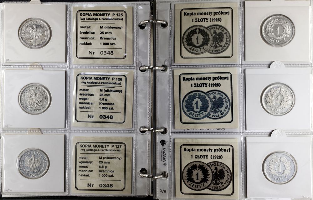 | Opis: | Polska - II Rzeczpospolita Polska (1918–1939) - oficjalne kopie, zestaw 27 replik monet II RP wykonane nakładem Nefrytu, 1919–1939 (daty oryginałów), Kremnica, zestaw zawiera kopie monet: 2 grosze 1923, 50 marek 1923, 50 groszy 1938, 3 x 1 złoty 1928 (3 różne odmiany), 1 złoty 1929 (nominał w wieńcu), 1 złoty 1929 (głowa kobiety), 2 złote 1924, 5 złotych 1927 (Nike), 5 złotych 1930 (Nike), klipa 5 złotych 1936 (żaglowiec), 10 złotych 1925 (dwa popiersia), klipa 10 złotych 1933 (Sobieski), klipa 10 złotych 1933 (Traugutt), klipa 10 złotych 1934 (Piłsudski), 2 x 10 złotych 1934 (klamry - duża i mała średnica), 20 złotych 1924 (monogram RP), 20 złotych 1925 (głowa kobiety), 50 złotych 1924 (rycerz), 100 złotych 1922 (Piłsudski), 2 x 100 złotych 1925 (Kopernik - duża i mała średnica), 10 złotych 1934 (klamry - mała średnica w mosiądzu), 10 złotych 1925 (Chrobry - w mosiądzu), 20 złotych 1925 (Chrobry - w mosiądzu) |