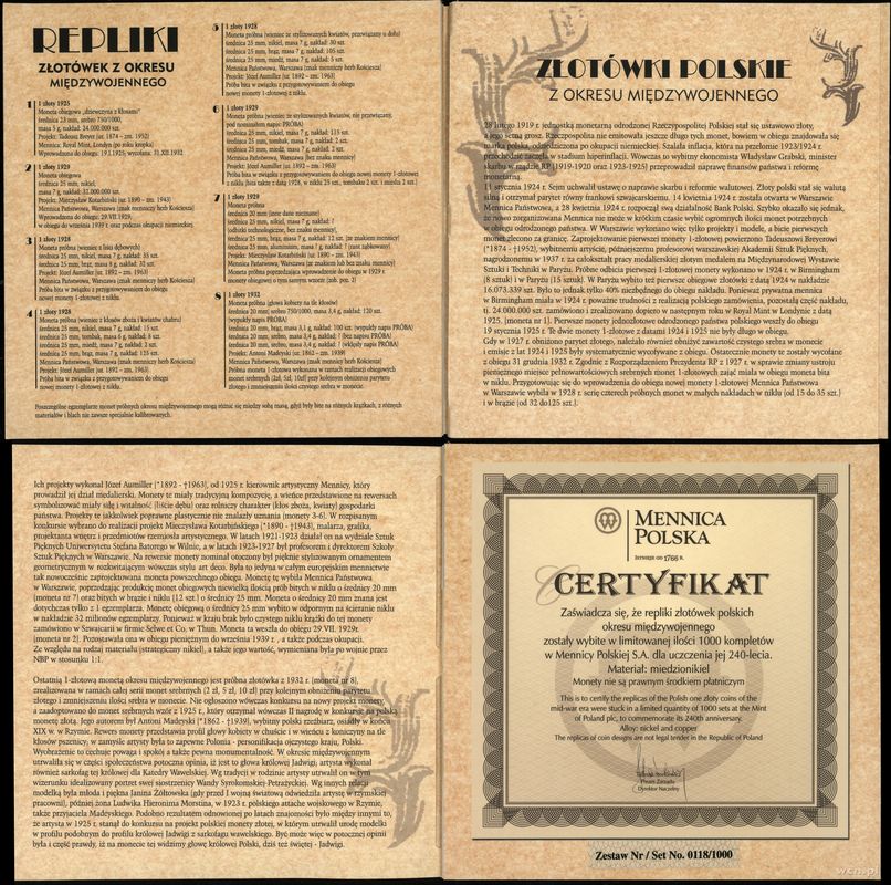 | Opis: | Polska - II Rzeczpospolita Polska (1918–1939) - oficjalne kopie, zestaw 8 replik złotówek okresu międzywojennego, 2006, Warszawa, w skład zestawu wchodzi 8 wizerunków złotówek z wizerunkami monet obiegowych i próbnych okresu II RP |