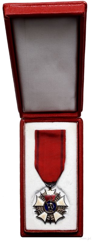 | Opis: | Polska - XX wiek - Polska powojenna i Polska Rzeczpospolita Ludowa (1945–1989), Order Sztandaru Pracy II klasy, Warszawa, Pięcioramienny krzyż, w kątach promienie, w medalionie robotnik z młotem i proporcem, na stronie odwrotnej w medalionie PRL, order dwuczęściowy, mocowany na wstążkę, wykonany w Mennicy Państwowej, dodatkowo pudełko |