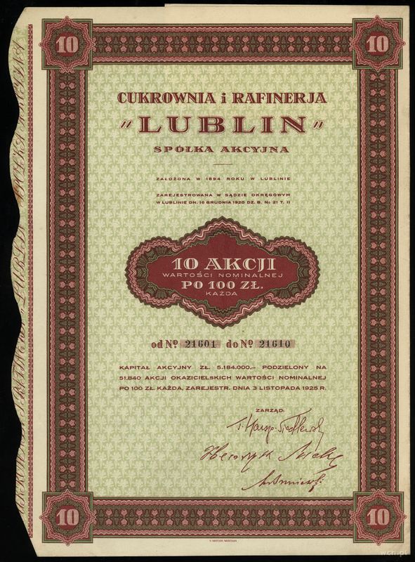 | Opis: | Polska - Cukrownia i Rafinerja „Lublin" S.A., zestaw 2 akcji, 3.11.1925, 1 akcja na 100 złotych, numeracja 01560 oraz 10 akcji po 100 złotych = 1.000 złotych, numeracja od 21601 do 21610 |