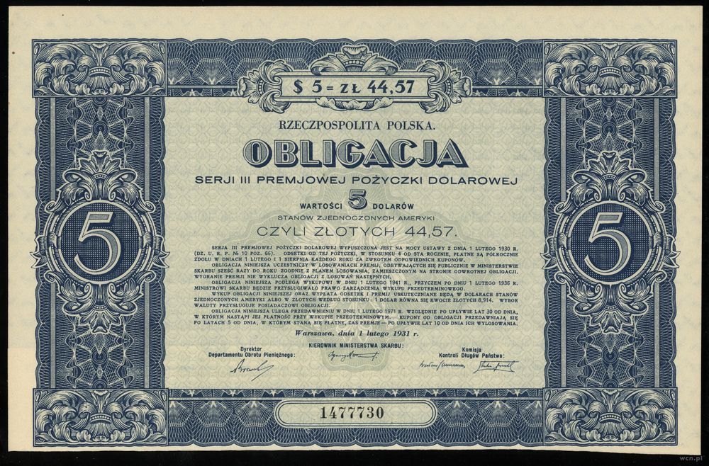 | Opis: | Polska, zestaw 3 papierów wartościowych, 1924–1931, 1) obligacja 5 % Państwowej Pożyczki Konwersyjna wartości 10 złotych 1.09.1924 Warszawa 2) obligacja pożyczki dolarowej wartości 5 dolarów = 44.57 złotego, 1.02.1931, Warszawa 3) 5 % list zastawny na 60 złotych 1.01.1925, Kalisz |