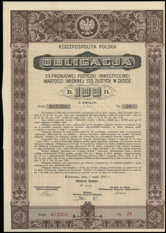 Rzeczpospolita Polska (1918–1939), 2 x obligacja 3% premiowej pożyczki inwestycyjnej na 100 złotych w złocie, 1.05.1935