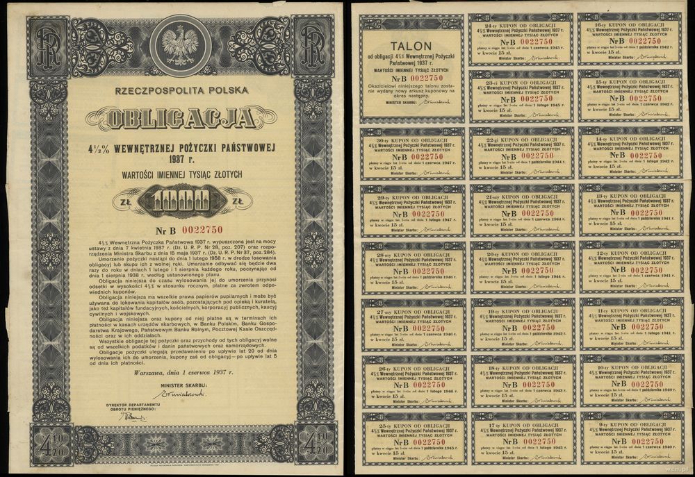 Rzeczpospolita Polska (1918–1939), zestaw: obligacja 4 1/2 % wewnętrznej pożyczki państwowej na 500 i 1.000 złotych, 1937