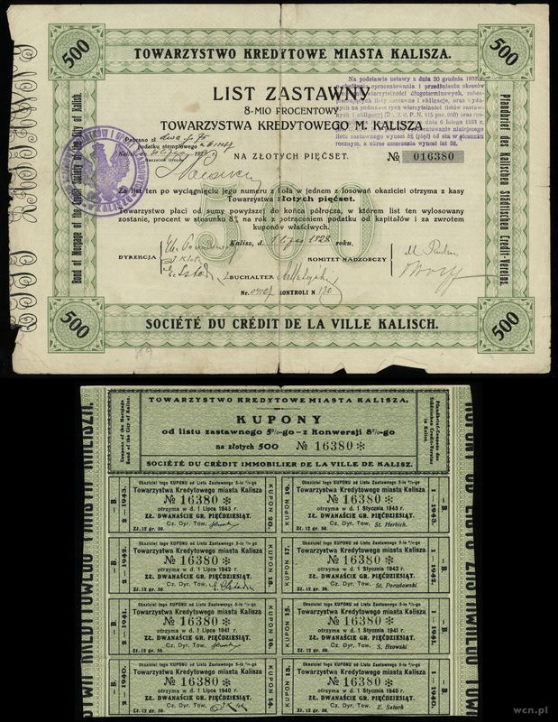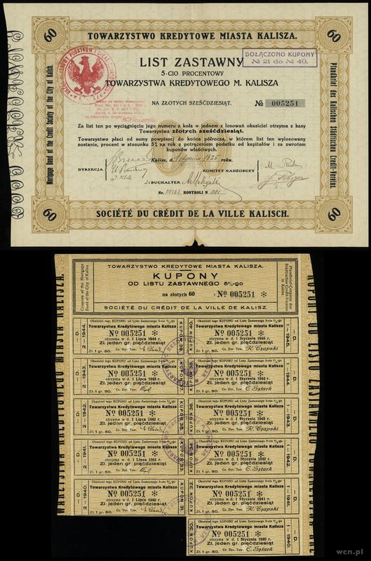 | Opis: | Polska - Towarzystwo Kredytowe Miasta Kalisza, zestaw 3 listów zastawnych, 1925–1928, Kalisz, 1) 5 % list zastawny na 40 złotych, 1.01.1925 2) 5 % list zastawny na 60 złotych, 1.01.1925 3) 8 % list zastawny na 500 złotych, 1.07.1928 |