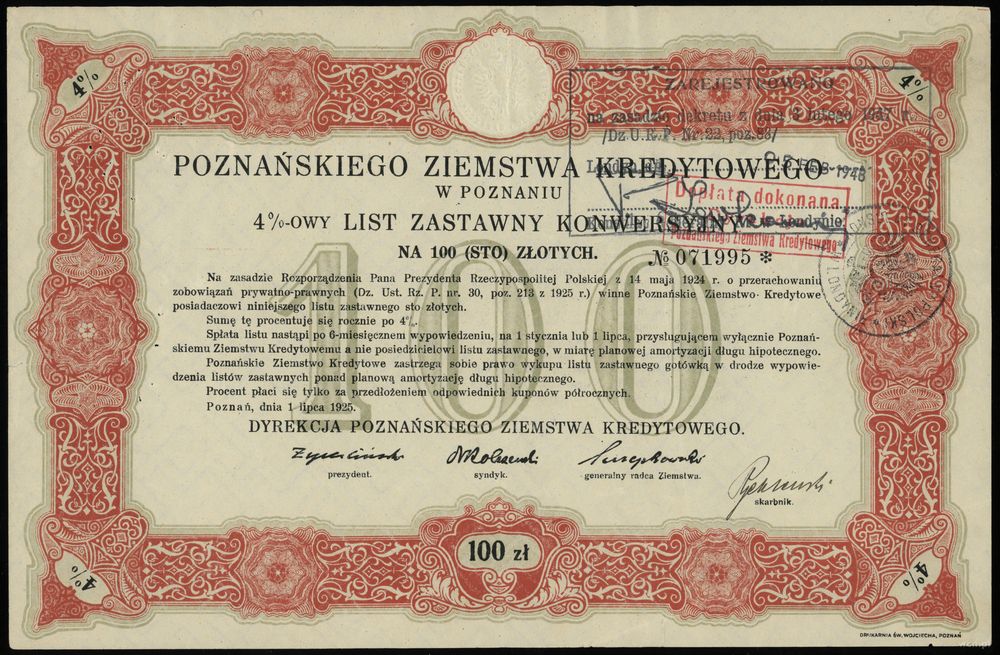 | Opis: | Polska - Poznańskie Ziemstwo Kredytowe, zestaw: 4% list zastawny konwersyjny na 10 i 100 złotych, 1.07.1925, Poznań, numeracja 059263 / numeracja 071995 |