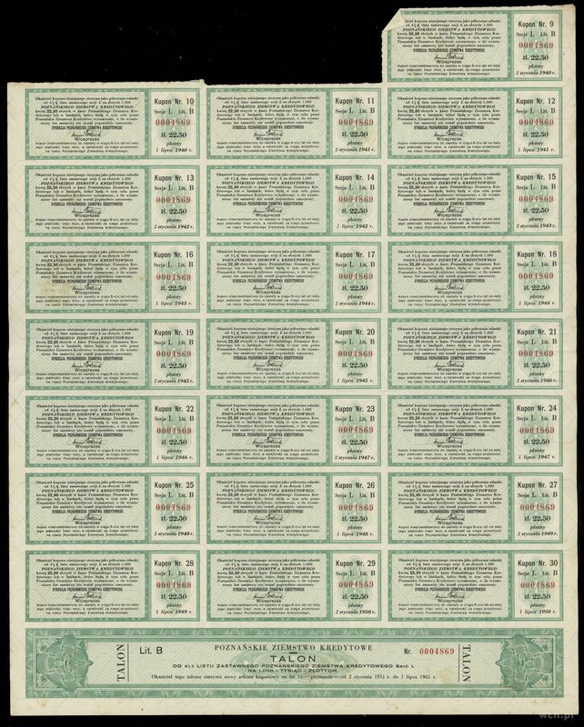 | Opis: | Polska - Poznańskie Ziemstwo Kredytowe, 4 1/2 % list zastawny na 1.000 złotych, 1.07.1935, Poznań, seria L - B, numeracja 0004869, z talonem i 22 kuponami |