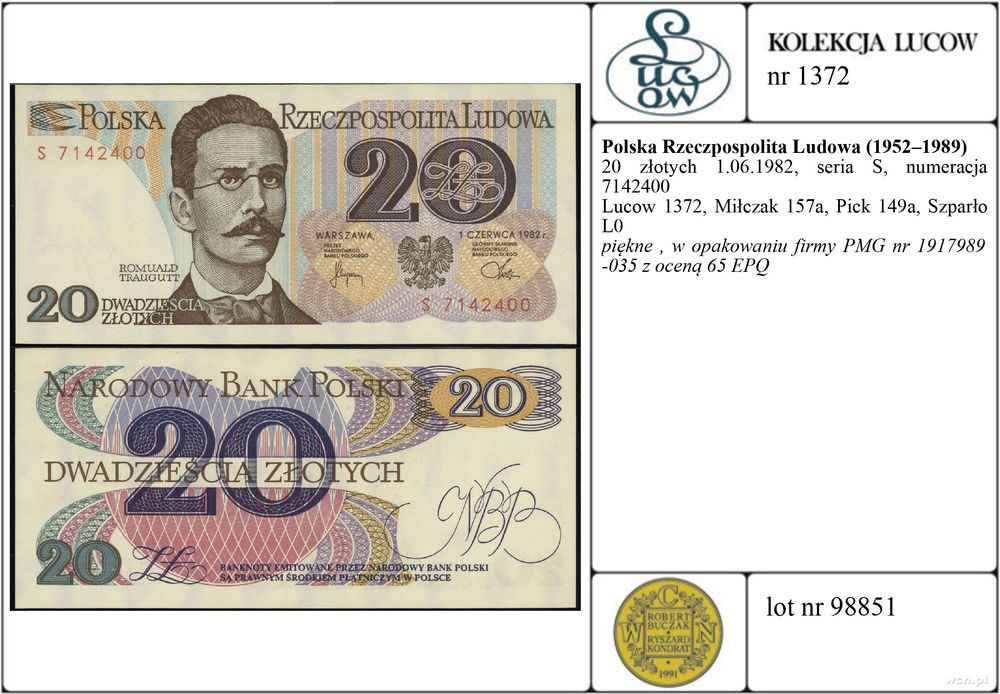 | Opis: | Polska - Polska Rzeczpospolita Ludowa (1952–1989), 20 złotych, 1.06.1982, seria S, numeracja 7142400 |