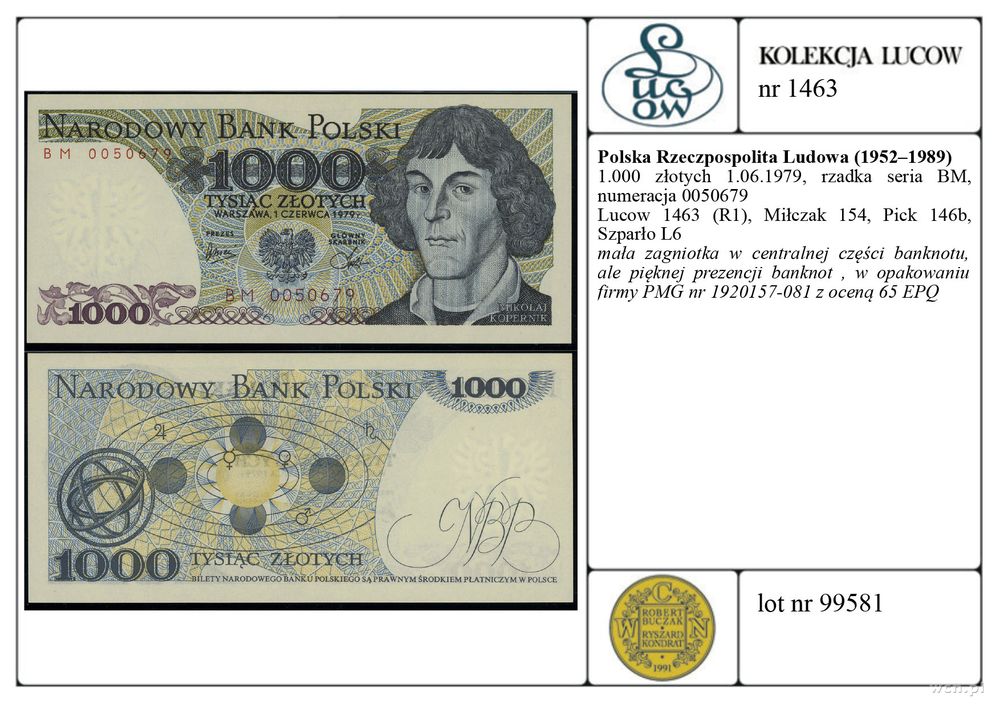 | Opis: | Polska - Polska Rzeczpospolita Ludowa (1952–1989), 1.000 złotych, 1.06.1979, rzadka seria BM, numeracja 0050679 |