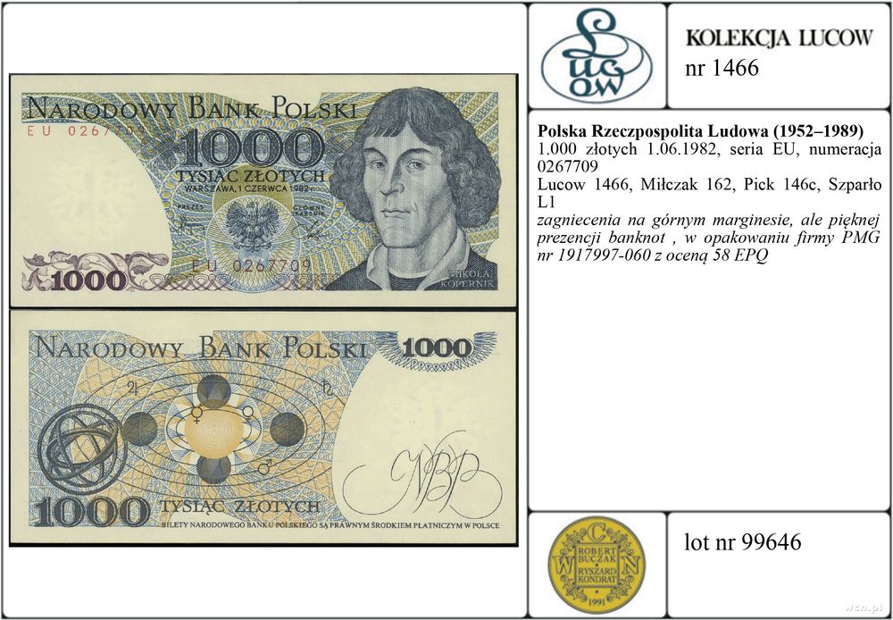 | Opis: | Polska - Polska Rzeczpospolita Ludowa (1952–1989), 1.000 złotych, 1.06.1982, seria EU, numeracja 0267709 |