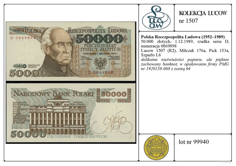| Opis: | Polska - Polska Rzeczpospolita Ludowa (1952–1989), 50.000 złotych, 1.12.1989, rzadka seria D, numeracja 0869898 |