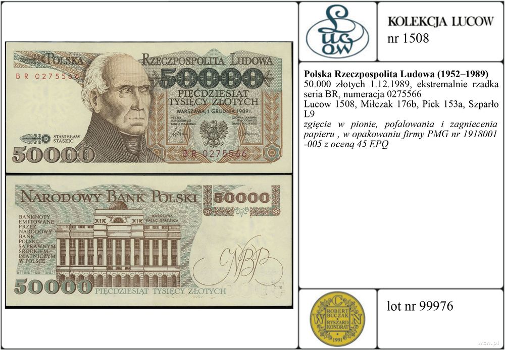 | Opis: | Polska - Polska Rzeczpospolita Ludowa (1952–1989), 50.000 złotych, 1.12.1989, ekstremalnie rzadka seria BR, numeracja 0275566 |