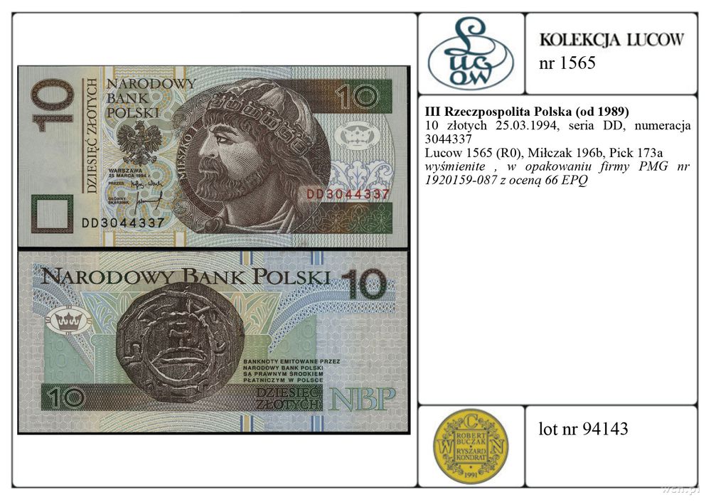| Opis: | Polska - III Rzeczpospolita Polska (od 1989), 10 złotych, 25.03.1994, seria DD, numeracja 3044337 |