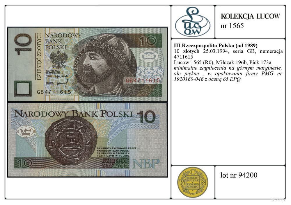| Opis: | Polska - III Rzeczpospolita Polska (od 1989), 10 złotych, 25.03.1994, seria GB, numeracja 4711615 |
