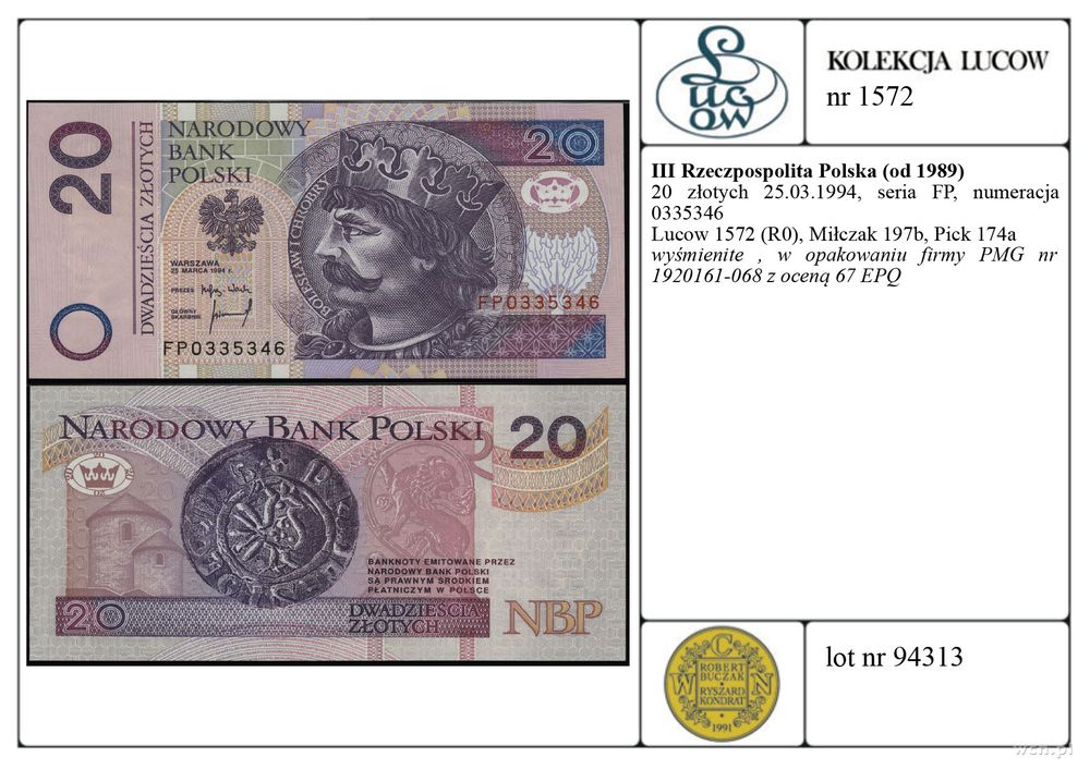 | Opis: | Polska - III Rzeczpospolita Polska (od 1989), 20 złotych, 25.03.1994, seria FP, numeracja 0335346 |