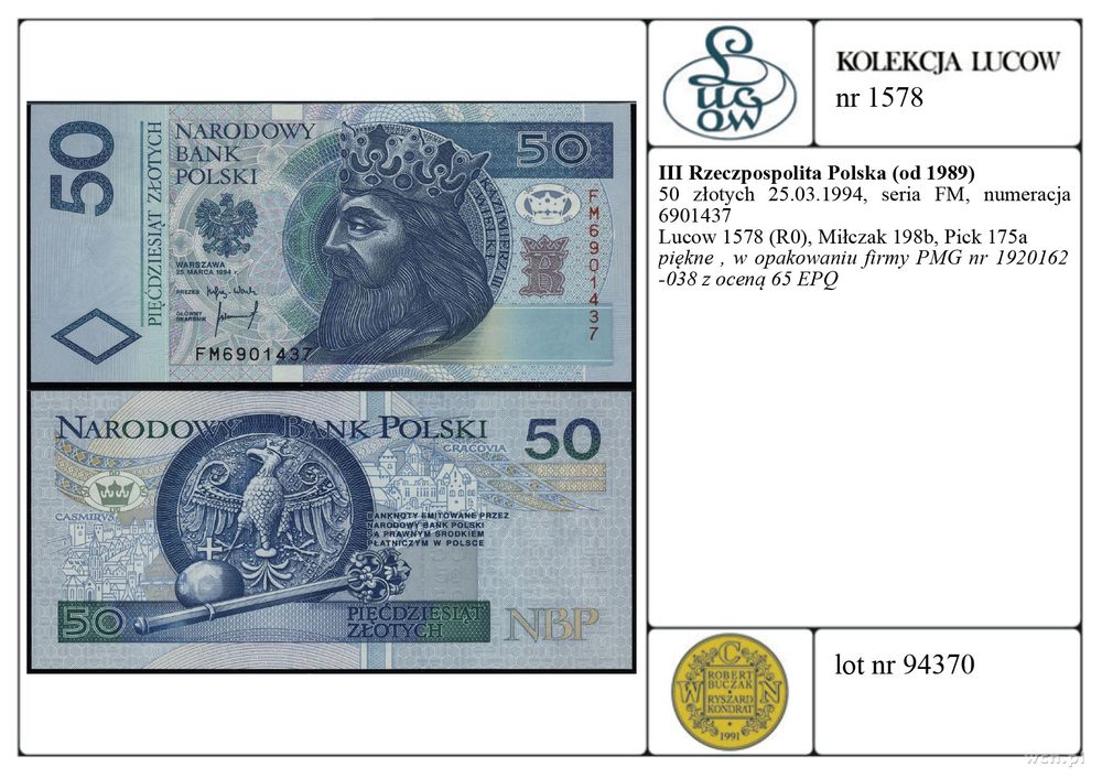 | Opis: | Polska - III Rzeczpospolita Polska (od 1989), 50 złotych, 25.03.1994, seria FM, numeracja 6901437 |