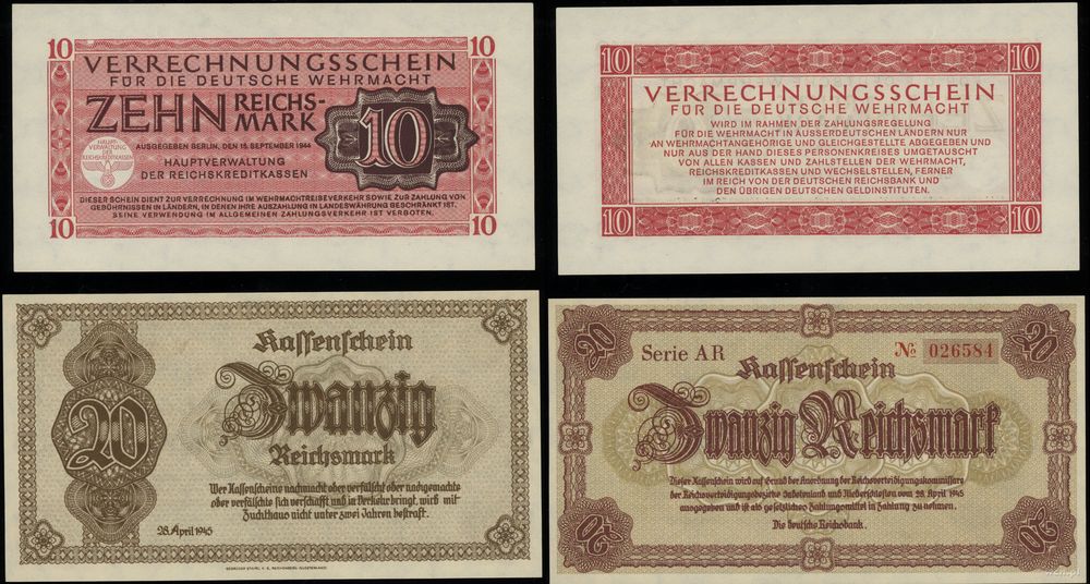 | Opis: | Niemcy - Reichskreditkassen (1939–1944), zestaw 7 banknotów, 1939–1945, nominały: 1 Reichspfennig 1942, 5 Reichspfennig 1942, 1 marka (1939-1944), 2 marki (1939-1944), 1 marka 1944, 10 marek 1944, 20 marek 1945 |