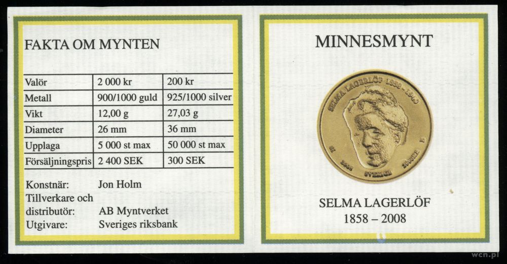 | Opis: | Szwecja - Karol XVI Gustaw (od 1973), 200 koron, 2008, Eskilstuna, 150 rocznica urodzin - Selma Lagerlöf |