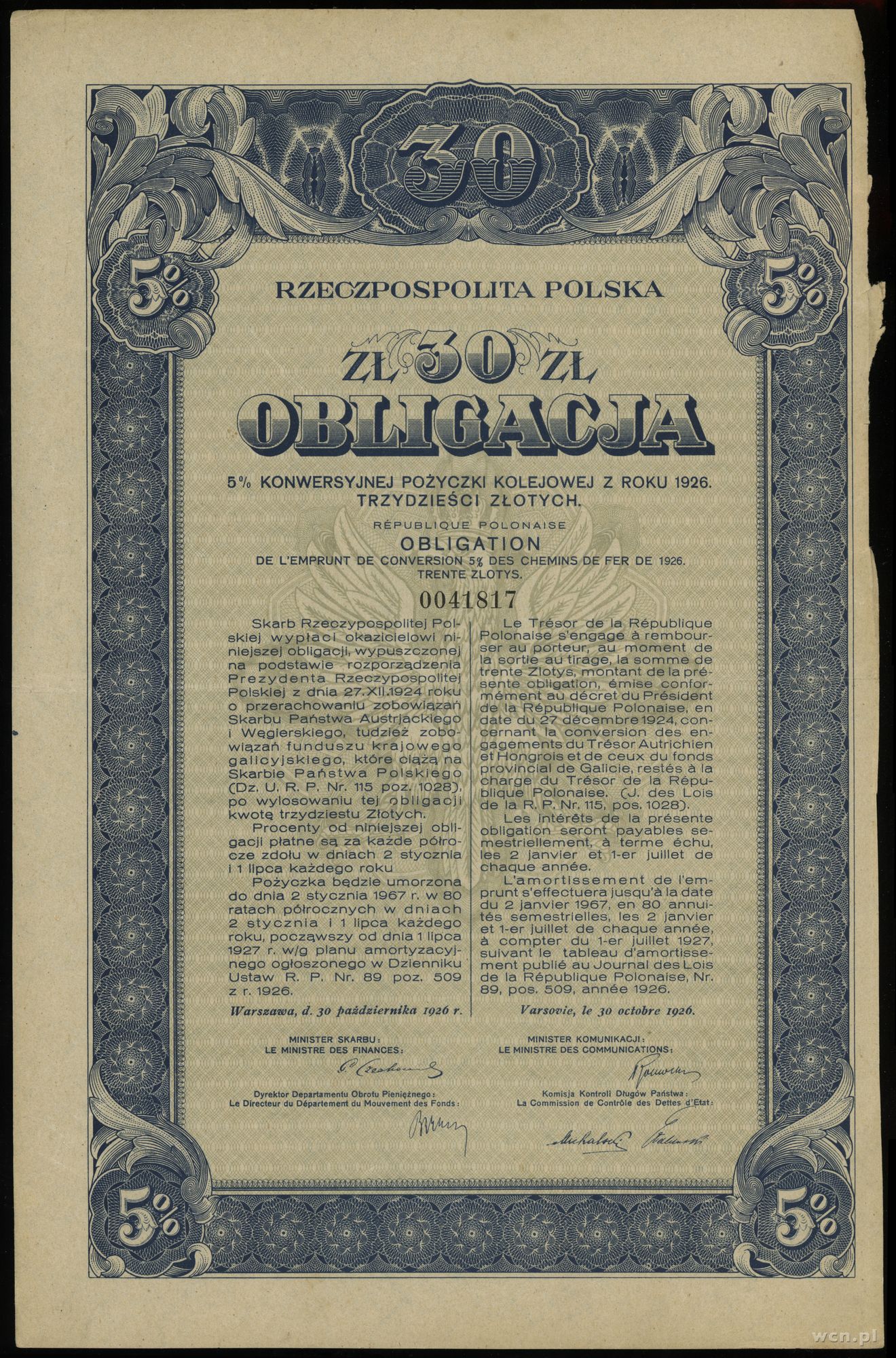 Rzeczpospolita Polska (1918–1939), 5% obligacja konwersyjnej pożyczki kolejowej na 30 złotych, 1926