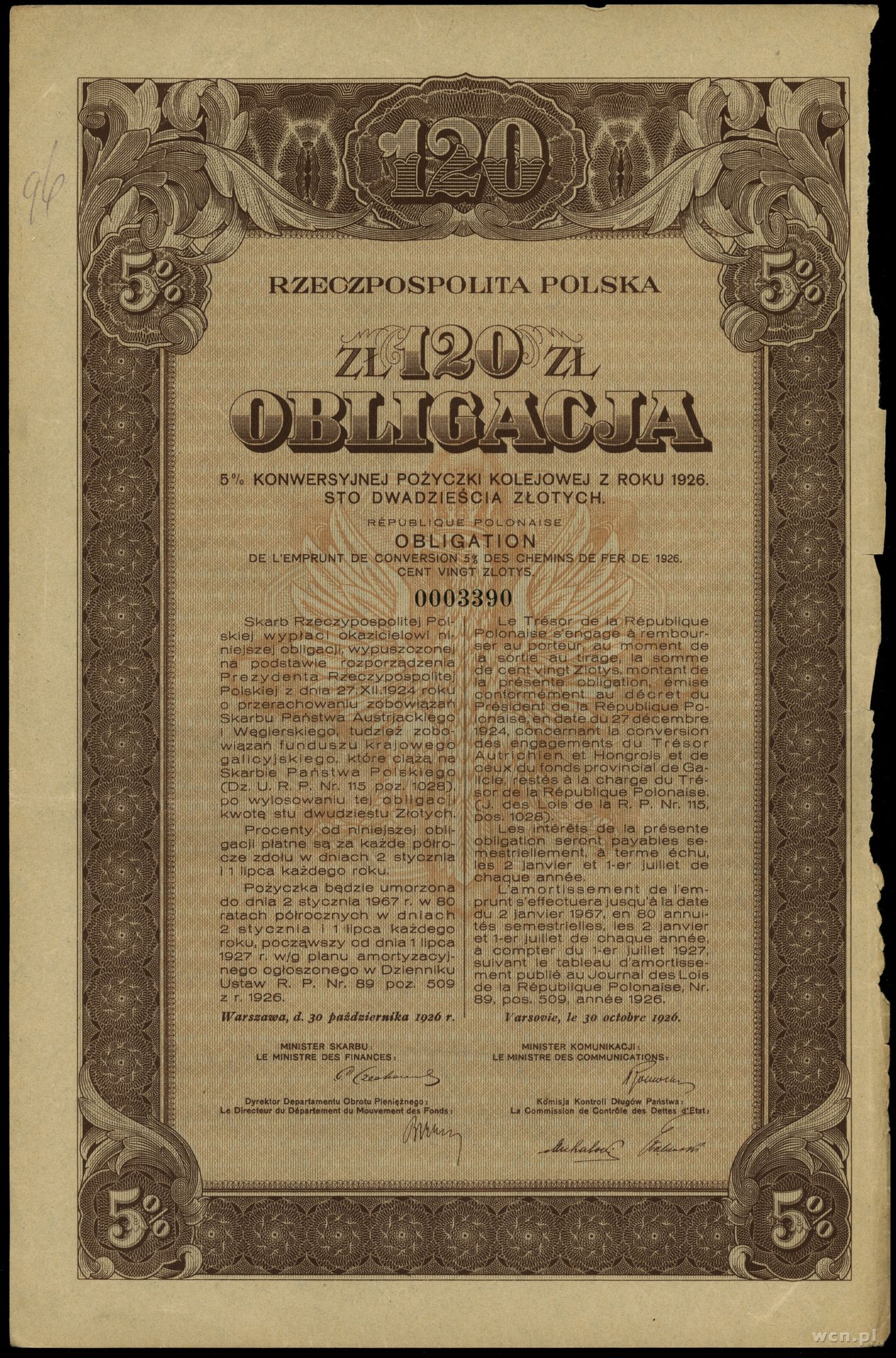 Rzeczpospolita Polska (1918–1939), 5% obligacja konwersyjnej pożyczki kolejowej na 120 złotych, 1926