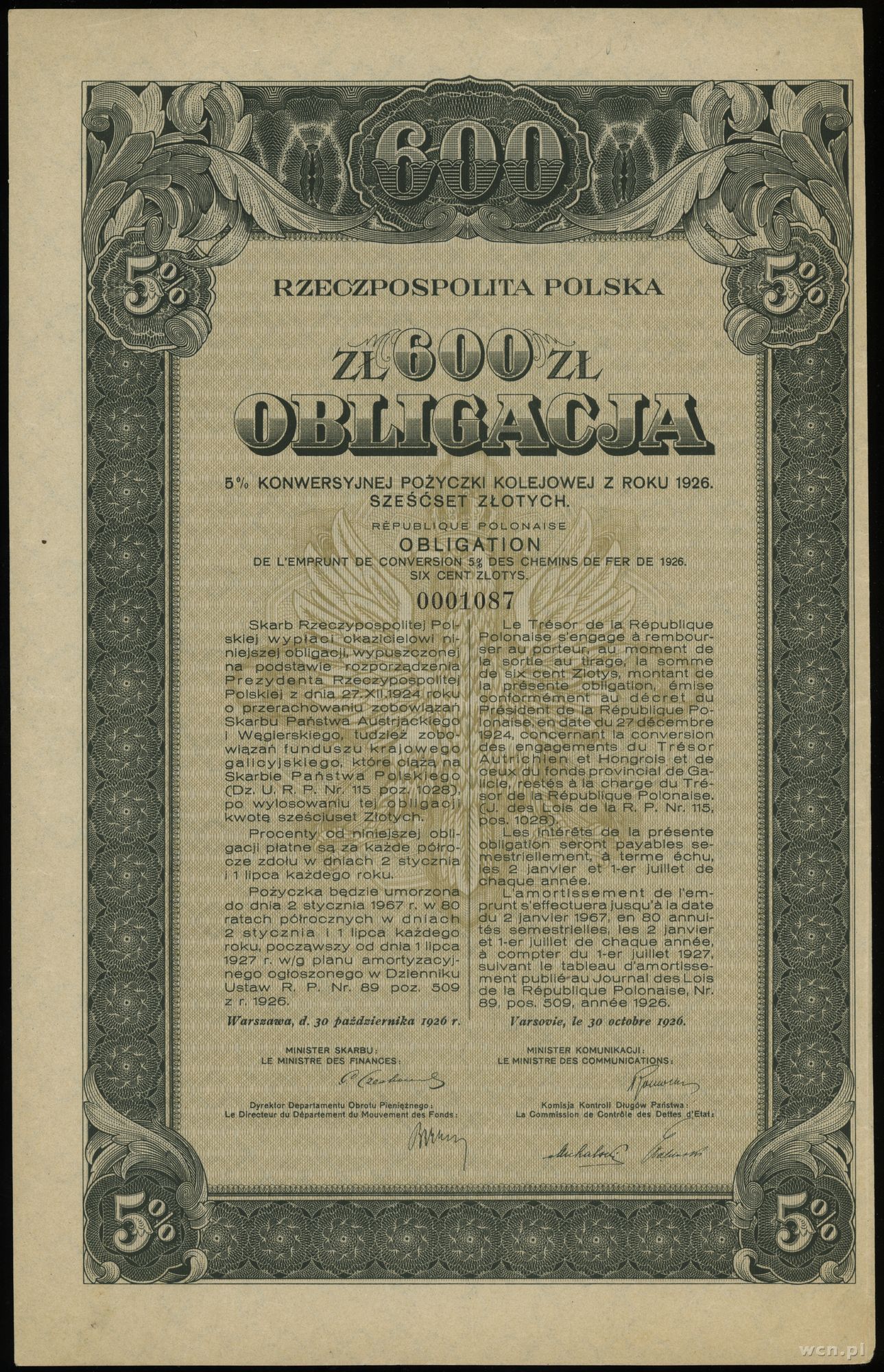 Rzeczpospolita Polska (1918–1939), 5% obligacja konwersyjnej pożyczki kolejowej na 600 złotych, 1926
