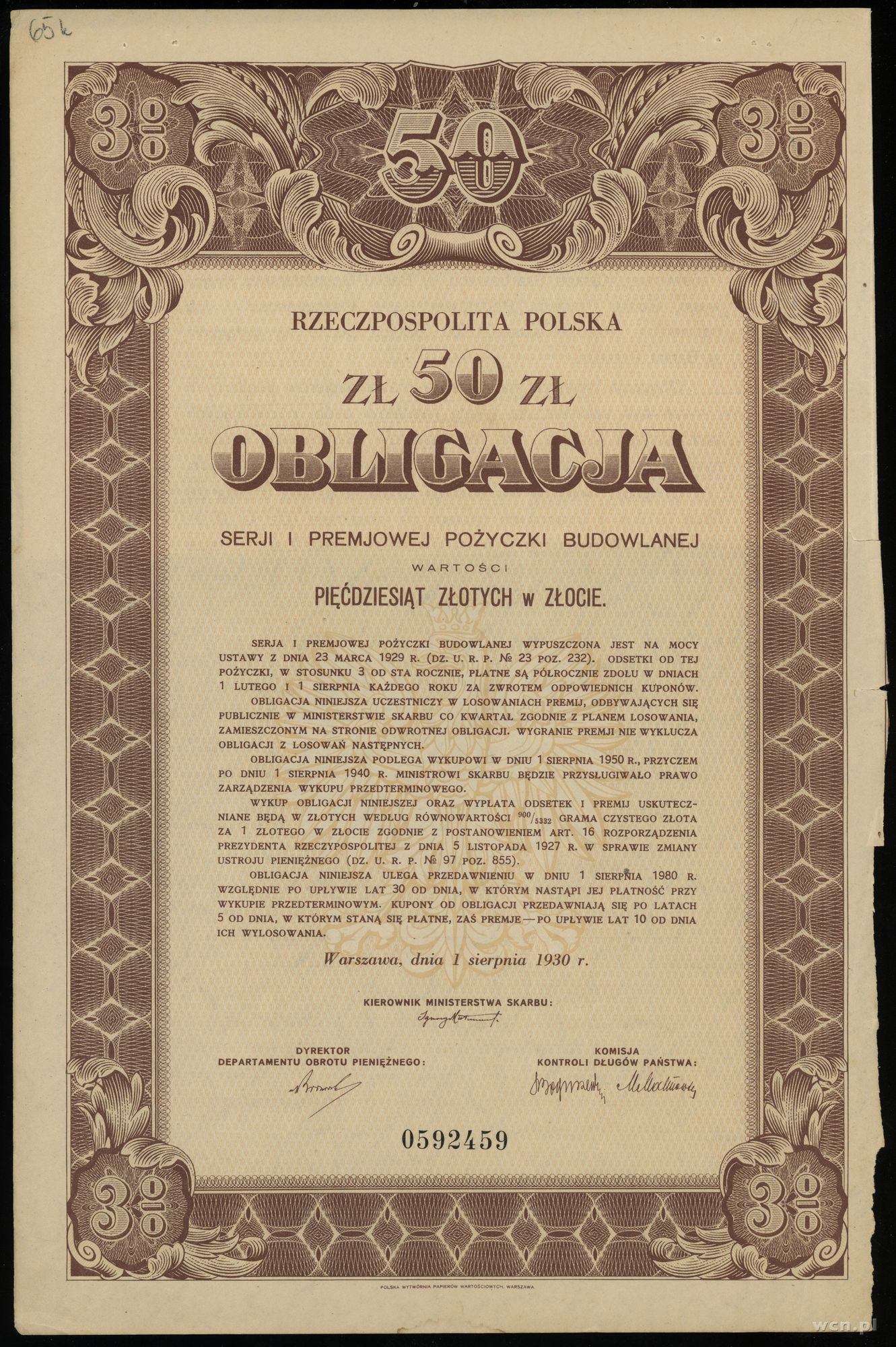 Rzeczpospolita Polska (1918–1939), obligacja na 50 złotych Premjowej Pożyczki Budowlanej, 1930
