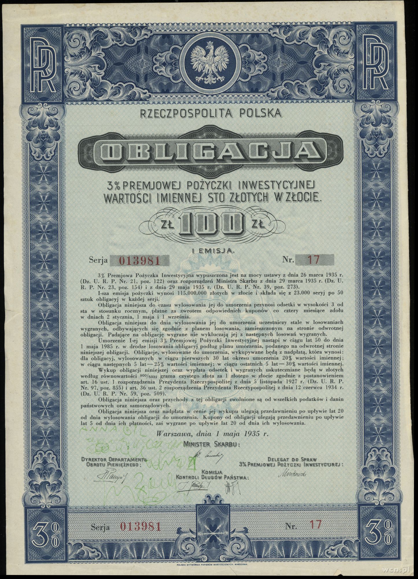 Rzeczpospolita Polska (1918–1939), 2 x obligacja 3% premiowej pożyczki inwestycyjnej na 100 złotych w złocie, 1.05.1935