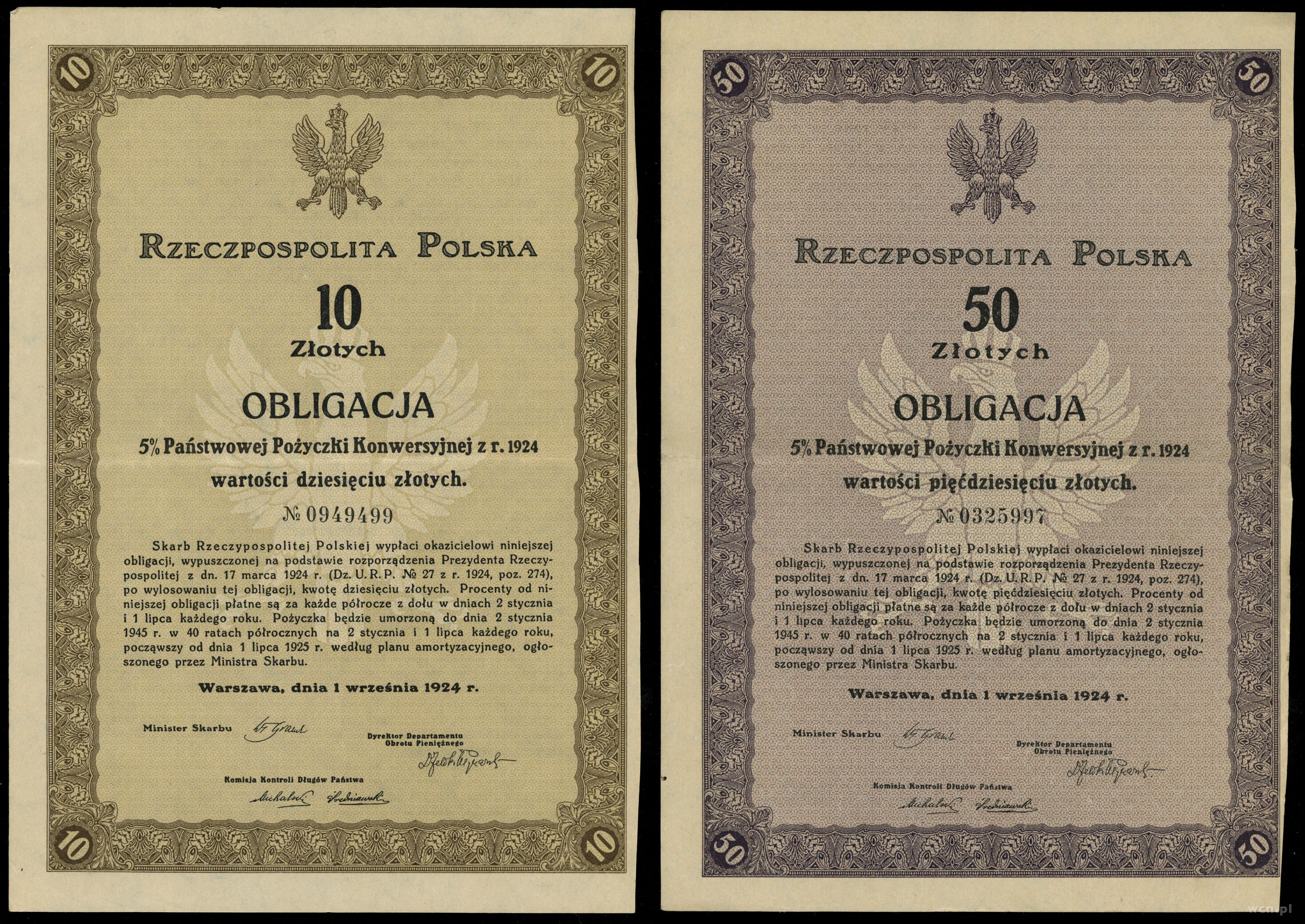 Rzeczpospolita Polska (1918–1939), obligacje 5 % Państwowej Pożyczki Konwersyjna wartości 10 i 50 złotych, 1.09.1924